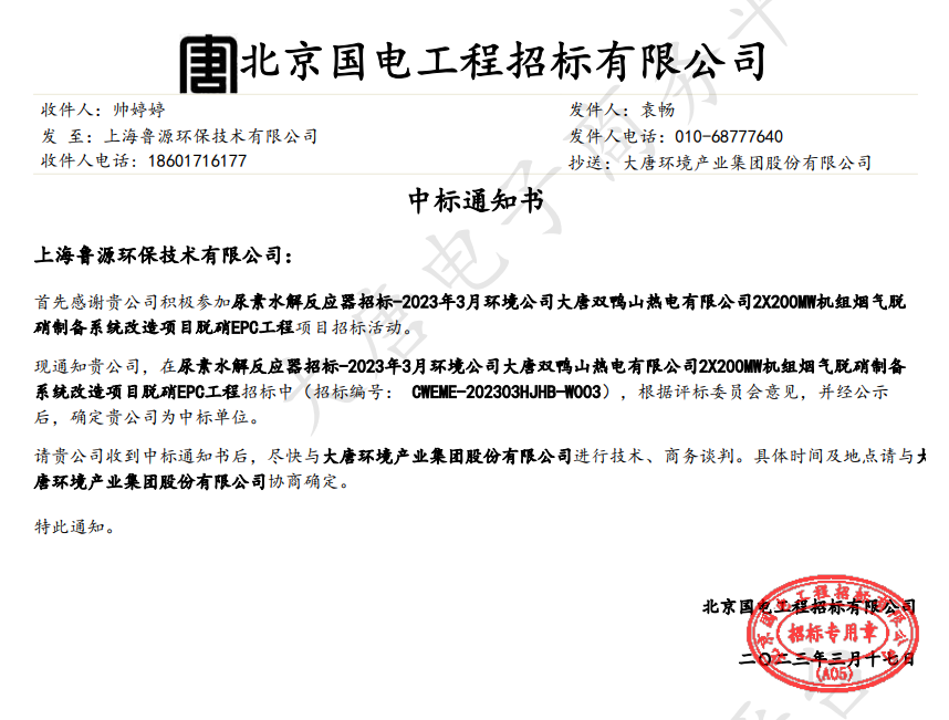 热烈祝贺我司在尿素水解反应器招标——2023年3月大唐环境公司大唐双鸭山热电有限公司2X200MW机组烟气脱硝制备系统改造项目脱硝EPC工程中成功中标。