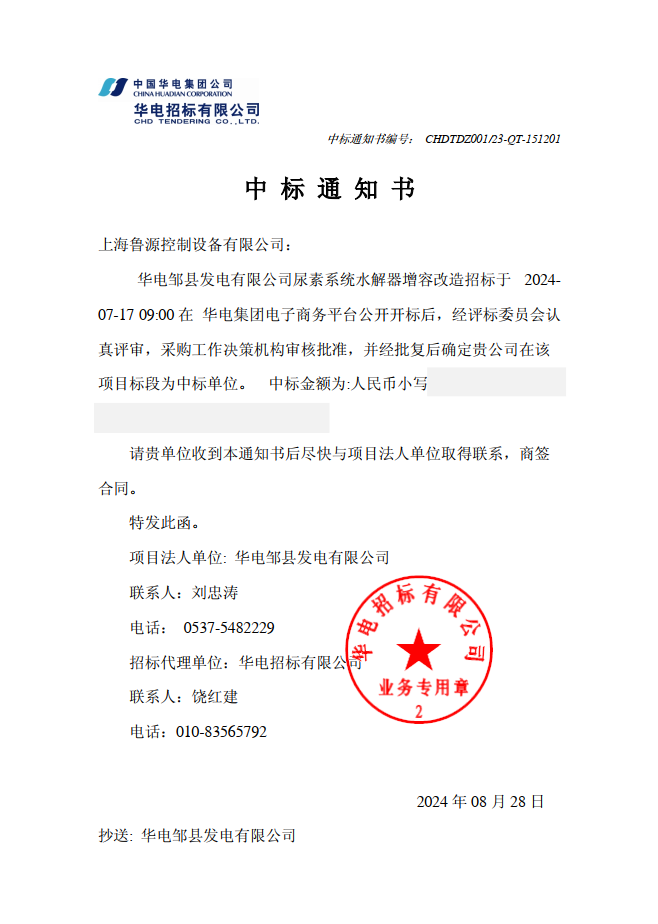 华电邹县发电有限公司尿素系统水解器增容改造项目成功中标