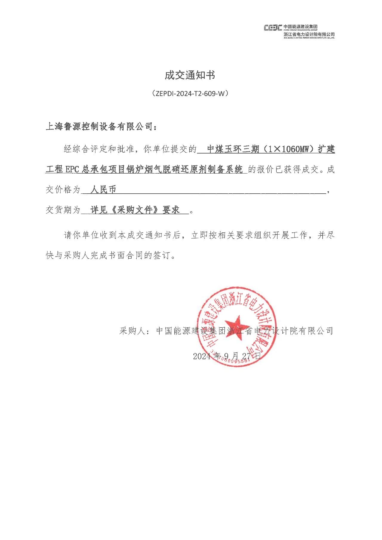 中煤玉环三期(1X1060MW)扩建工程 EPC总承包项目锅炉烟气脱硝还原剂制备系统成功中标