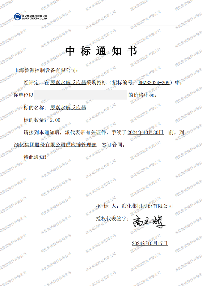 滨化集团股份有限公司尿素水解反应器成功中标