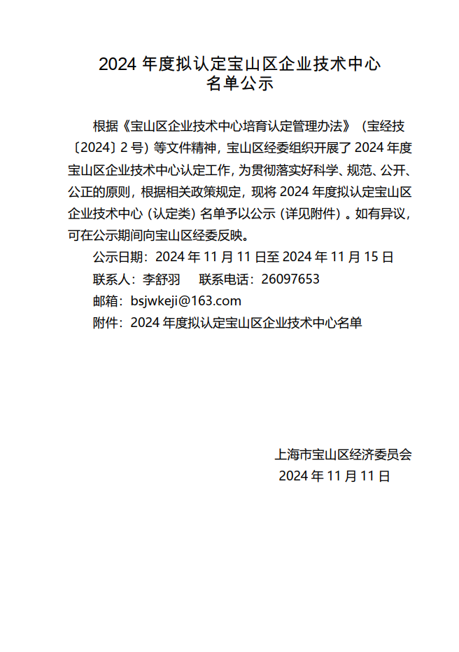 荣获上海市宝山区企业技术中心认定