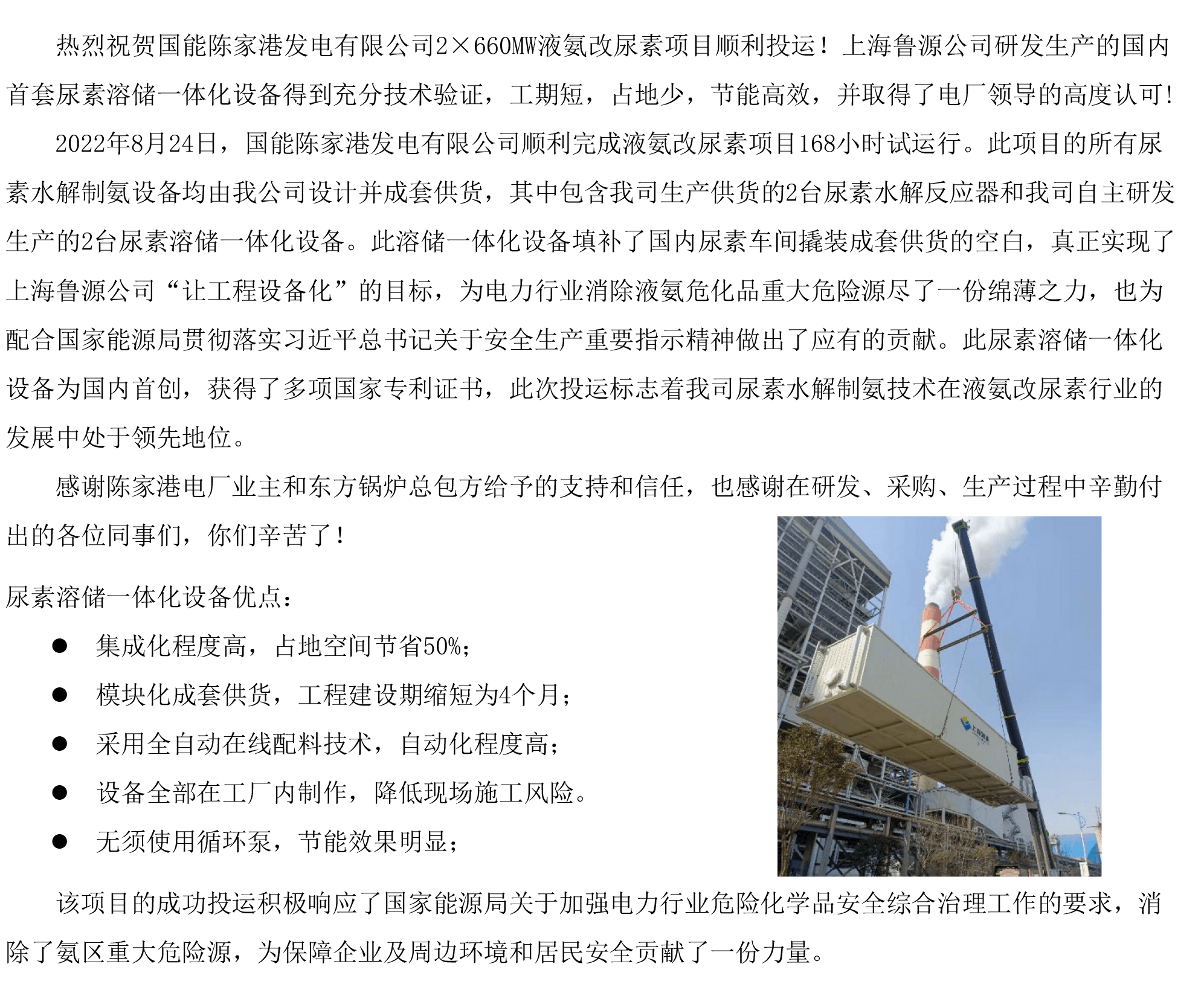 国内首套尿素溶储一体化设备在国能陈家港电厂顺利投运