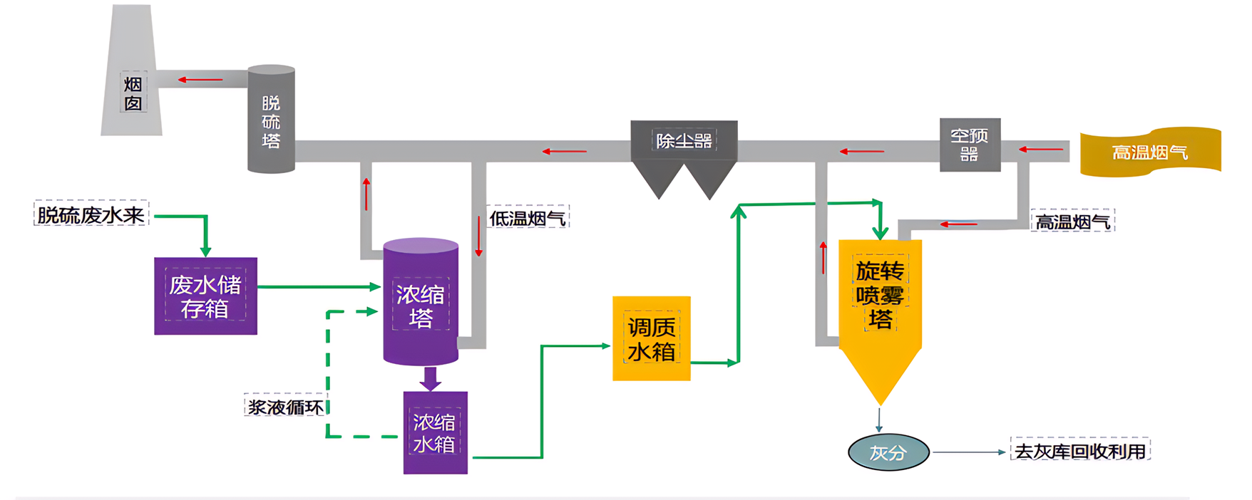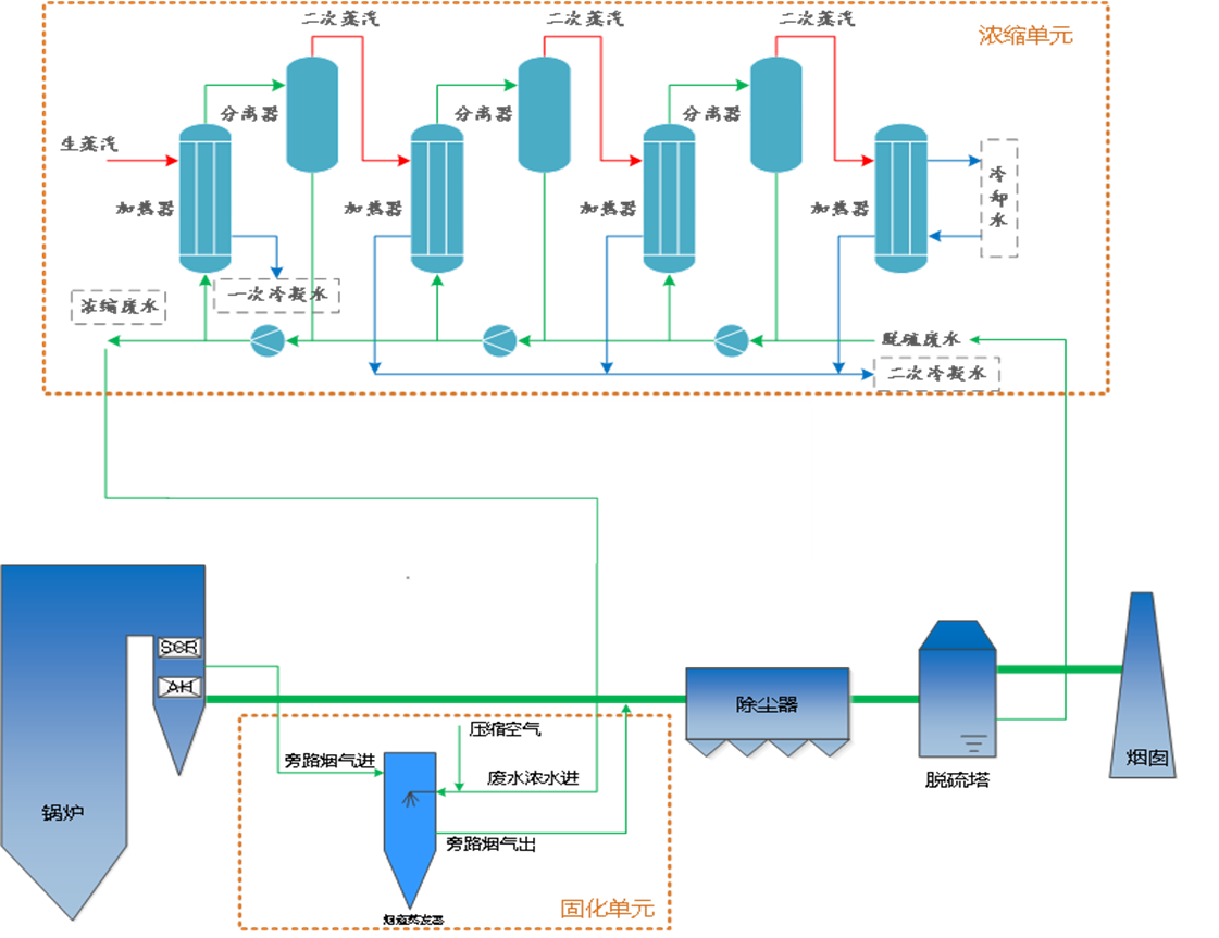 利用在锅炉尾部除尘器与脱硫塔之间设置浓缩塔,用泵将脱硫废水送到浓缩塔喷嘴喷淋,直接利用电厂锅炉烟气余热(约110~150C)对干燥塔内喷淋的脱硫废水逆流接触进行蒸发浓缩处理,水分随烟气排放,浓缩液通过泵送入压滤分离装置形成滤饼固化外排。